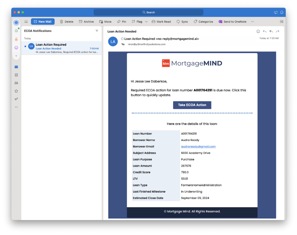 You will receive an email from no-reply@mortgagemind.ai and the email subject will be: Loan Action Required and it’s very important that you take action on this email!